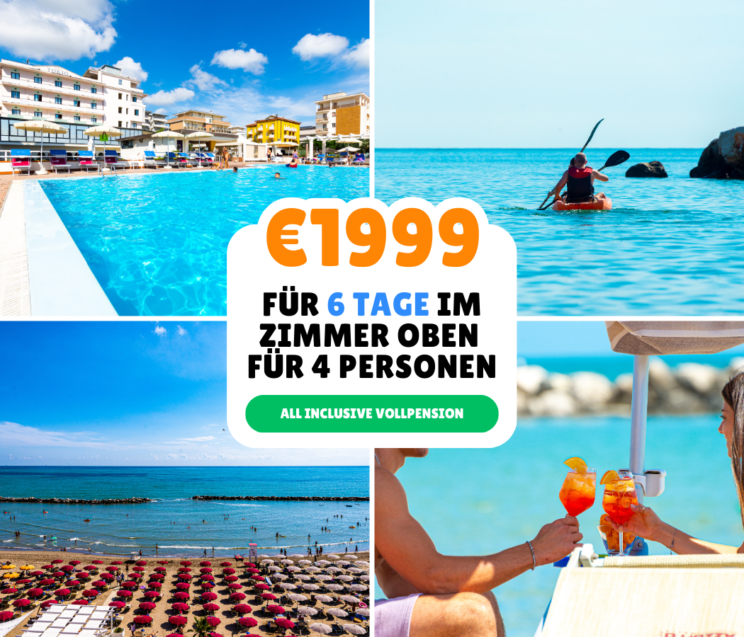 Melden Sie sich anBieten Sie 6 Tage Vollpension vom 24. bis 30. August für 1999 € in einem Zimmer für bis zu 4 Personen an